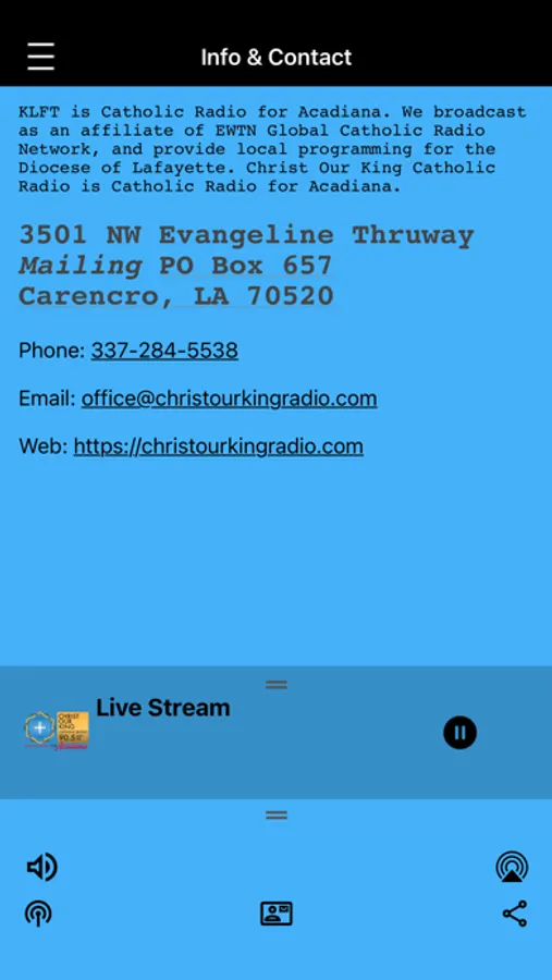 The Mission of our Apostolate Christ Our King Communications Apostolate endeavors to answer Christ’s call to evangelize. We will do this through the mediums of radio, internet, and Digital TV Channel 50.5. We broadcast as an affiliate of the EWTN Global Catholic Radio Network and provide local programming featuring Religious and laity within the Diocese of Lafayette. Additionally, we provide services to our Bishop, churches, Catholic Schools, and other 501(C)(3)nonprofit humanitarian organizations by providing broadcast and visual announcements at no cost.