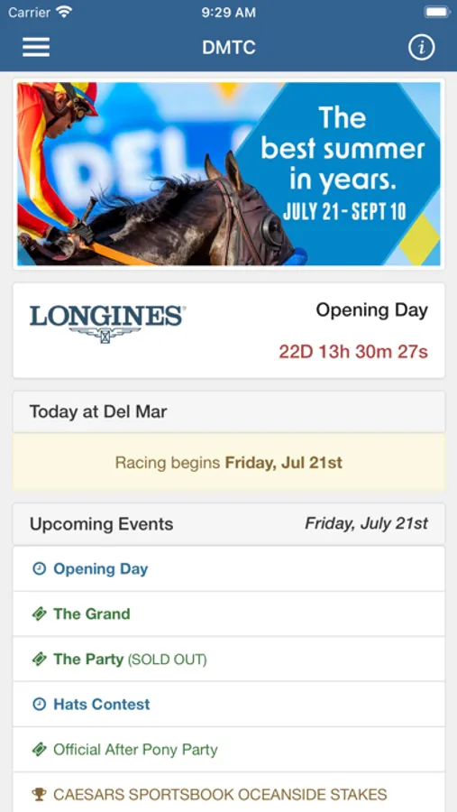 The Del Mar Thoroughbred Club (DMTC) is proud to announce our 2023 DMTC Mobile App. Bring the race-day experience to life on your iPhone. View events and concert line-ups held at the racetrack during race season, receive exclusive promotions and offers, view race programs, results, handicapping information and much more.