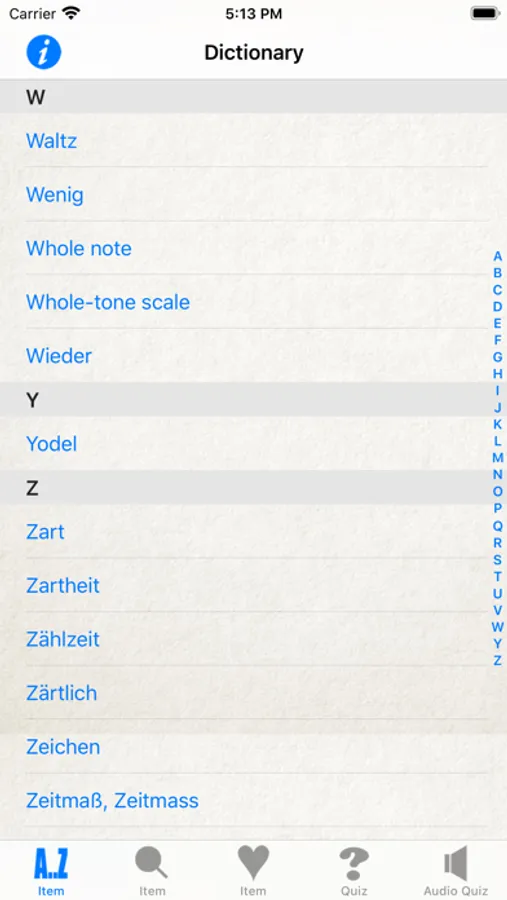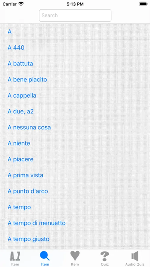 Musical Terms with Quiz is a music dictionary with audio pronunciation. It contain over 1100 terms regarding music notation, musical forms, musical expressions and directions. All the foreign terms, Italian, French and German contain audio pronunciation. All the audio files are included in the app, no need for internet connection.
