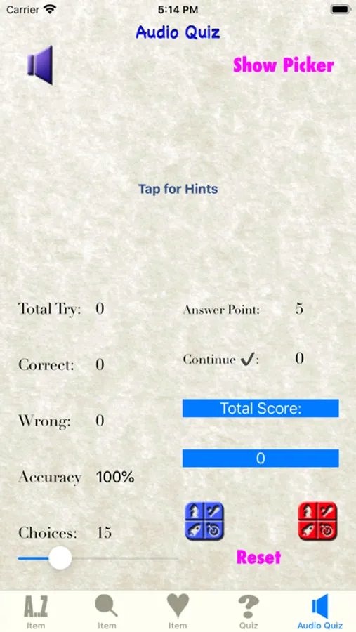 The Music Quiz game - The given quiz is an explanation of a musical term, you have to select the answer to the quiz in the picker. You can choose the number of choices with the slider, fewer choices will be easier. If you want a harder game, you may want more choices. There is also a hint information button, it will telling you the answer's initial character.
