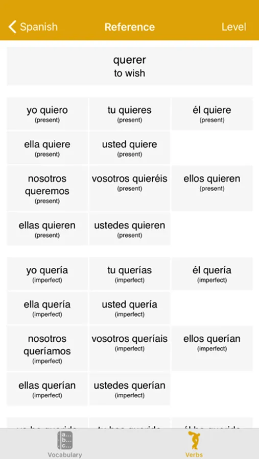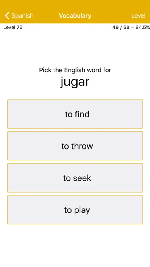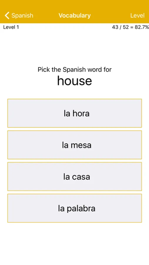 • Vocabulary: 200 levels, each testing the translation of 10 words between Spanish and English. Interspersed among these are cumulative levels reviewing what has been learned earlier (giving a total of 225 levels).