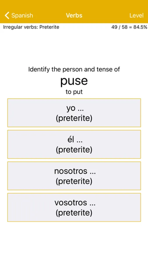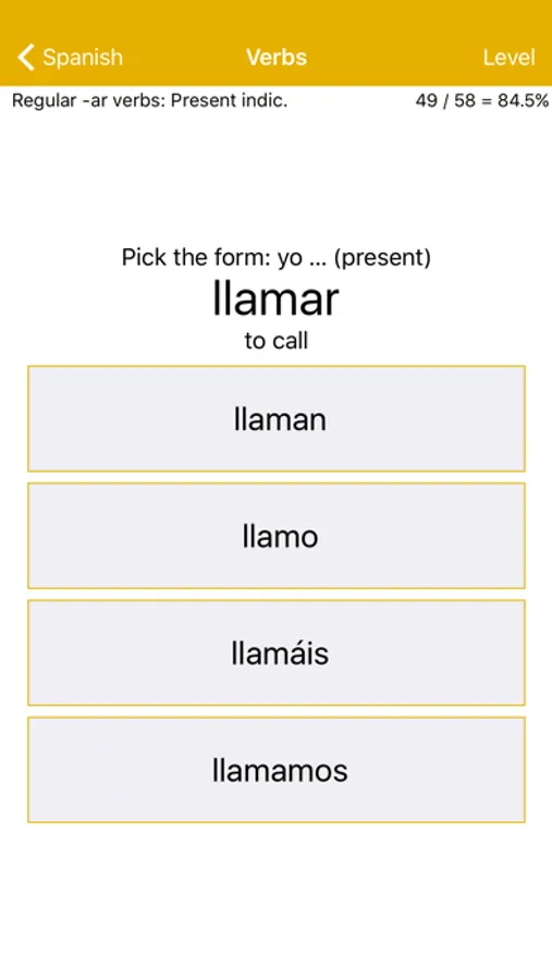 Whenever you have your phone and a free moment, it offers a continuous multiple-choice test on Spanish vocabulary and verb conjugation. Each answer you give is immediately confirmed or corrected, and your knowledge is reinforced by repetition.