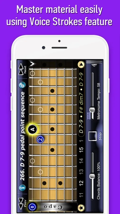 ● Every exercise is provided with corresponding optimal fingering and a sequence of strokes, showing you necessary strokes for every note of the exercise. These strokes (pick up, pick down, pull-off, hammer on, slide) are provided to help you to achieve high speed arpeggios and sequences playing. Please read the info page inside this application for detailed description on every stroke.