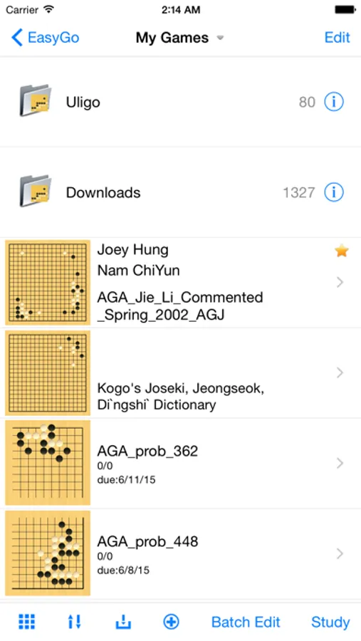 You can zip all your sgf files and transfer to EasyGo via iTunes file sharing or WiFi transfer.You can also download sgf/zip files from mobile safari and import to EasyGo easily. Mail attachment can also be imported to EasyGo. EasyGo will be installed to handle SGF/ZIP files, and can import files from many mobile app(such as Dropbox).