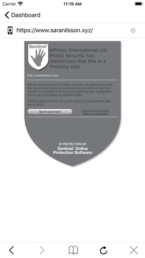 Once Sentinel® mobilesafe software is installed on your smartphone, it will also provide you with protection whilst browsing the internet against the phishing sites. If you try to navigate to a phishing page, a warning will appear, allowing you to steer away and safeguard you from entering personal or financial data.