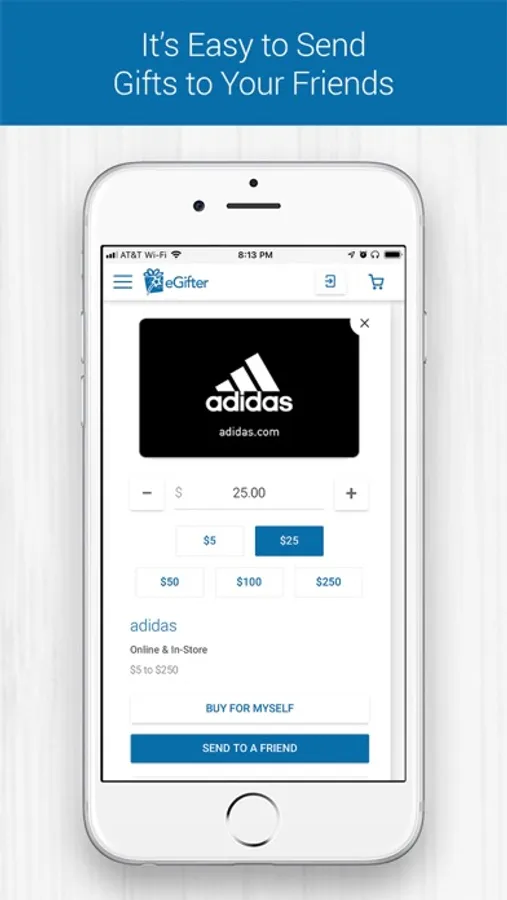eGifter makes it easier than ever to buy your favorite eGift Cards on the go. Buy for yourself or a send a personalized eGift to a friend. Choose from over 300 top national and regional brands - delivered instantly to your mobile device or PC.