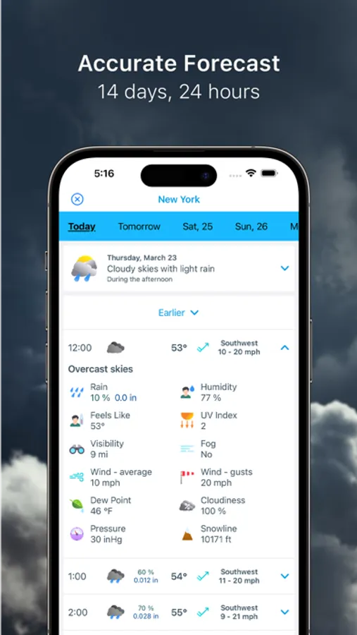 Check the current conditions along with the forecast for the next 14 days with a simple slide of your finger. Select a day to view detailed hourly information including heat index or temperature, precipitation, wind speed and direction, wind chill, pressure, cloudiness, humidity, UV index, sunset and sunrise times and even the phase of the moon. Turn your device sideways to see how the weather local will evolve throughout the day with our amazing graphics.