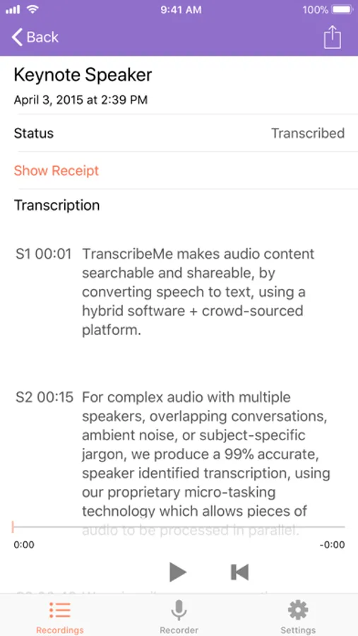TranscribeMe uses speech recognition and human transcriptionists to convert any audio or video files to text. Already trusted by hundreds of businesses worldwide, the TranscribeMe iOS app makes transcriptions on-the-go even easier.