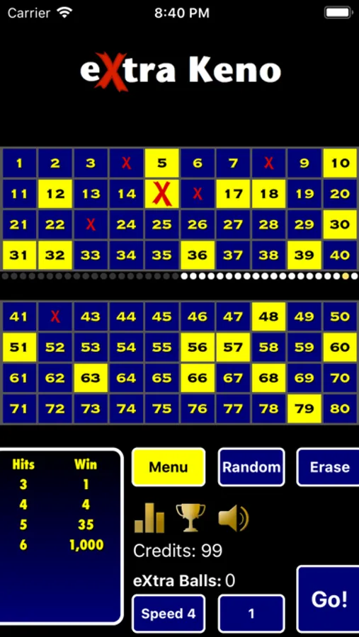 The game of eXtra Keno is like classic keno, with a twist. The twist is that you earn extra balls for each winning ball that is called. That means, if a number comes up and it rewards you a payout, or a higher payout, then you get a free eXtra ball for it. You can then use those extra balls at the end of a winning game, after the normal twenty balls have already come up. You can choose to have 5, 10, or 20 more balls be called on that game. In addition to the free eXtra Balls you earn, you can also purchase eXtra balls via in-app purchase.