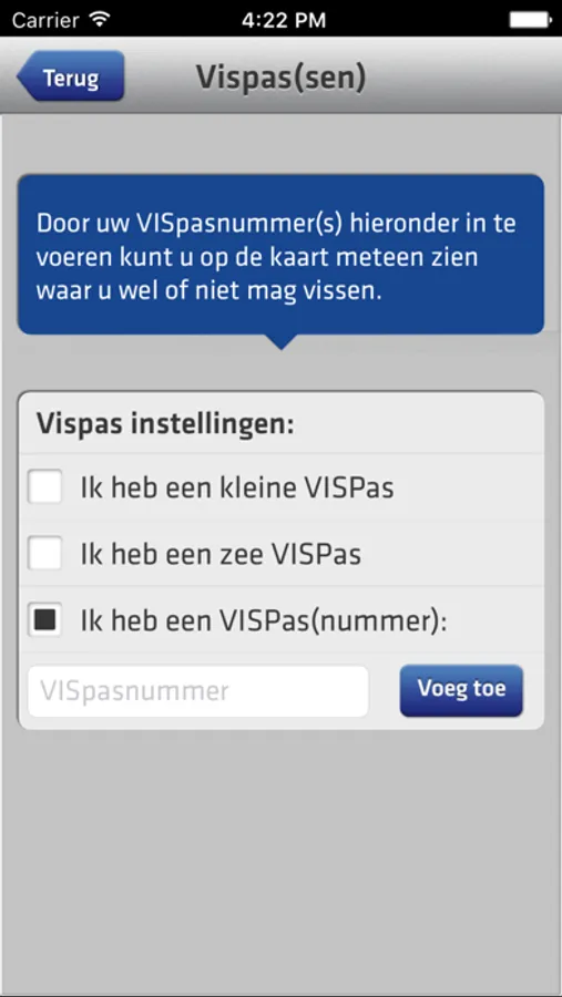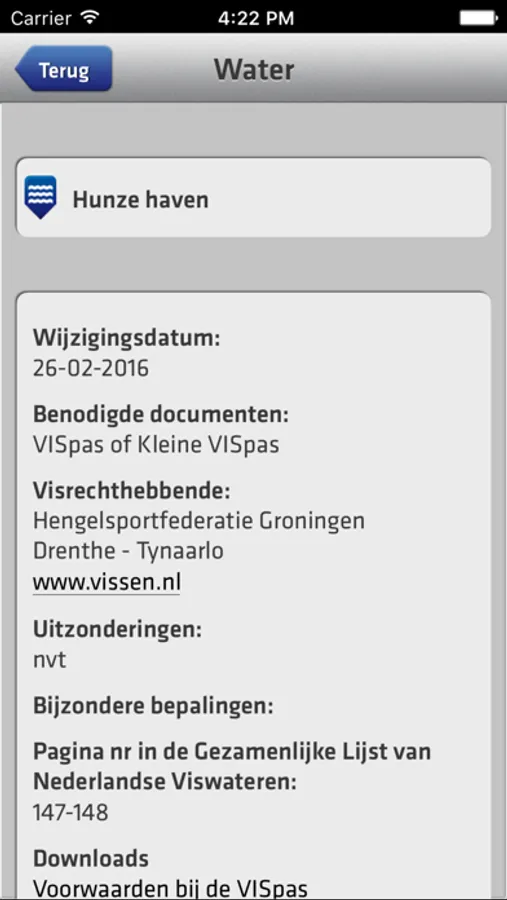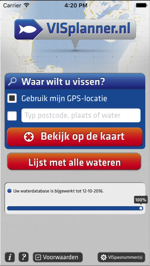 Deze app is behoorlijk omvangrijk maar hierdoor kun je ook met minder snelle internetverbindingen overal informatie over alle viswateren van Nederland raadplegen. Je download als het ware een interactieve versie van de papieren Gezamenlijke Lijst van Viswateren. De VISplanner is samen met de VISpas een geldige schriftelijke toestemming voor de wateren die blauw kleuren met jouw VISpasnummer ingevuld.