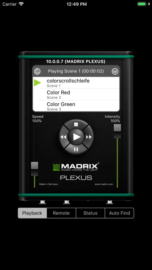 MADRIX PLEXUS is one of the smartest solutions to control your LEDs. This App let's you conveniently control the PLEXUS remotely. It was never easier to trigger Scenes or to change the Brightness or Speed of your lighting. And even if you turn off your Apple device, the light show continues just as you would expect. It is that simple.