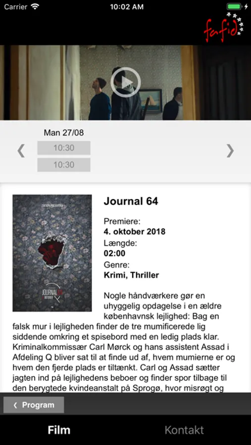 Med denne app har du mulighed for at gennemse Fafid's filmtræfprogram, samt se yderligere filminformationer som trailer, censur, medvirkende skuespillere, varighed m.m.