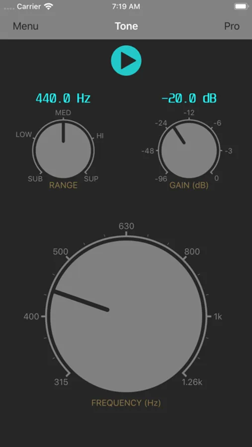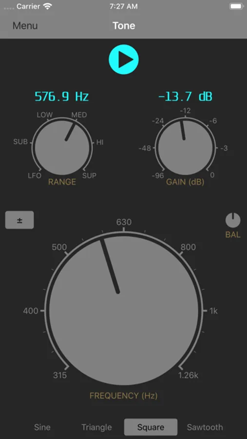 • Pro Tone Generator. (Optional in-app purchase). Extends the frequency range down to 1 Hz, and adds stereo control and buttons to increment the frequency in steps. Anti-aliased square waves, sawtooth waves, and triangle waves are generated with aliasing kept to -54 dB or less.
