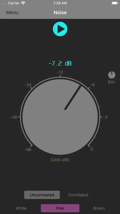 • Noise Generator. (Optional in-app purchase). Produces white noise, pink noise, and brown noise. Pink noise falls off at 3 dB per octave (±1 dB). Brown noise falls off at 6 dB per octave. Option for stereo uncorrelated noise, or mono correlated noise.