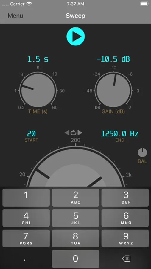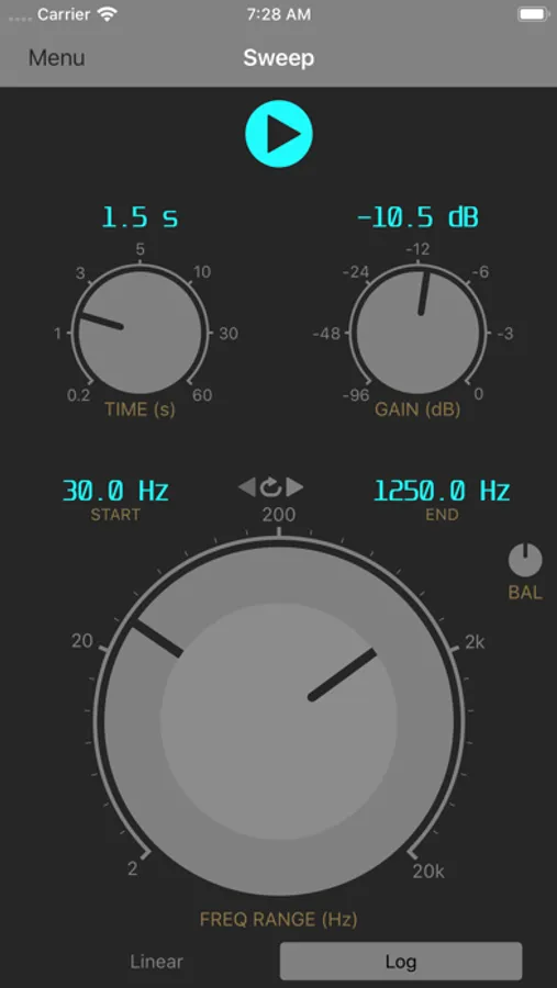 • Frequency Sweeps. (Optional in-app purchase). Adjustable start and stop frequencies. Linear or logarithmic sine wave frequency sweeps. Single shot sweeps, repeating upward sweeps, and upward/downward sweeps.