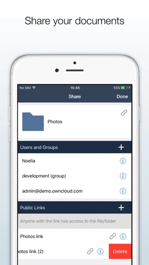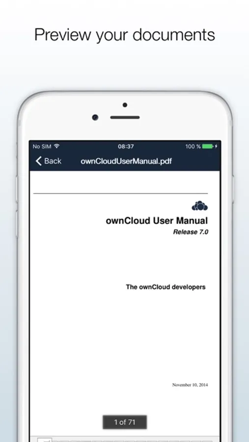 With the ownCloud iOS App you can browse all of your ownCloud synced files, create and edit new files, share these files and folders with co-workers, and keep the contents of those folders in sync across all of your devices. Simply copy a file into a directory on your server and ownCloud does the rest.