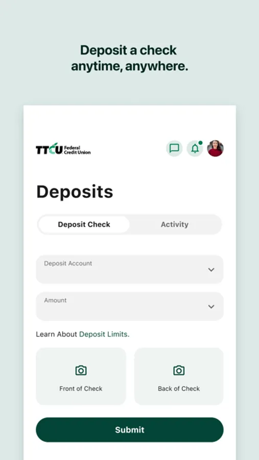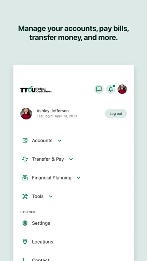 Control your finances from the palm of your hand with TTCU Mobile Banking. Download our latest mobile app today and securely manage your accounts on the go 24/7. Conveniently access your accounts, transfer money, deposit checks, monitor your credit score, track spending - all within TTCU's free mobile app.*