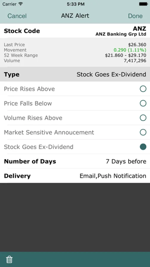 * Create stock alerts and receive push notifications to your Iphone or by email