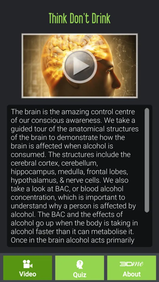 The brain is the amazing control centre of our conscious awareness. This health education App from the 'Consider Your Health' series contains a 10 minute video with captivating 3D animations, voiceover & graphics. It takes you on a guided tour of the anatomical structures of the brain, to demonstrate the structures affected when alcohol is consumed. These include the cerebral cortex, cerebellum, hippocampus, medulla, frontal lobes, hypothalamus, & nerve cells. We also take a look at BAC, or blood alcohol concentration, which is important to understand why a person is affected by alcohol. The BAC and the effects of alcohol go up when the body is taking in alcohol faster than it can metabolise it. Once in the brain alcohol acts primarily on the nerve cells, interfering with the communication between nerve cells in the brain and other cells, slowing everything down. Adventist Health believe in abstinence from alcohol.