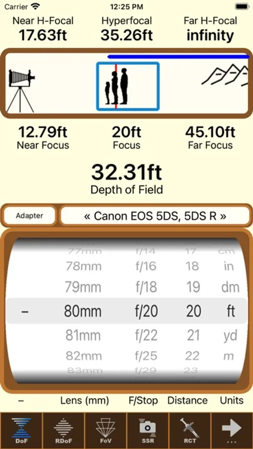 Depth of field describes the region of the photo that will be in sharp focus. An animated graphic outlines the region in focus in addition to the hyperlocal region. Use of speed boosters, teleconverters, bellows, extension tubes and diopters are supported. Adjustments for photo print sizes or viewing distances are included as an advanced feature.