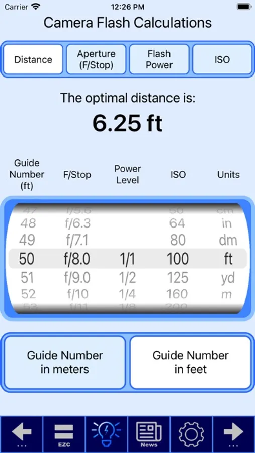 Flash information to determine optimal settings when a camera flash is used including calculations for ISO, aperture, distance and flash power settings.