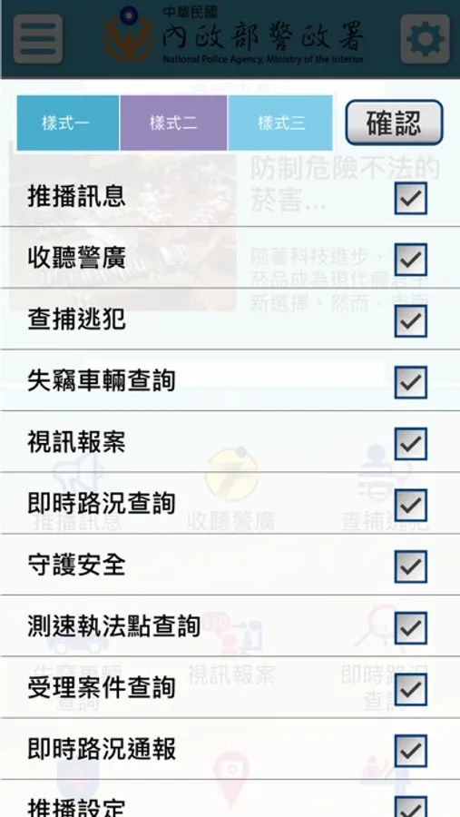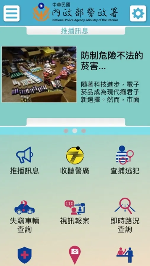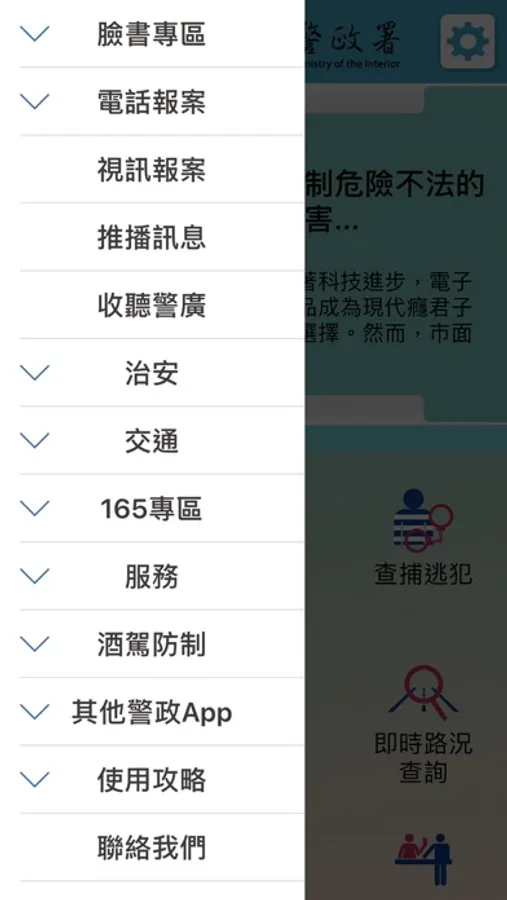 內政部警政署為持續精進本App服務品質及符合行政院響應式網站政策,讓操作介面能有整體性與一致性的風格,並相容於手機與平板電腦的操作與顯示,於107年重新規劃與整併已上架之App,如警察你在哪裡、警察刑事紀錄證明書、交通事故資料申請⋯等等,及以「快捷功能鍵、風格個人化」風格設計,讓各功能選單設定、資料內容可彈性依使用者之習性做調整;另因應當前政府施政以「打詐」為治安重點,增加165專區功能,將犯罪偵防及警政服務互相結合,提供即時貼心警政服務。其提供功能,分類如下: