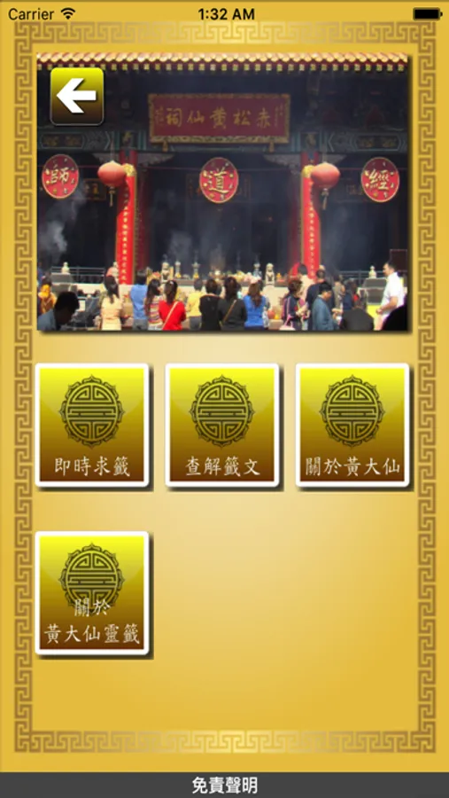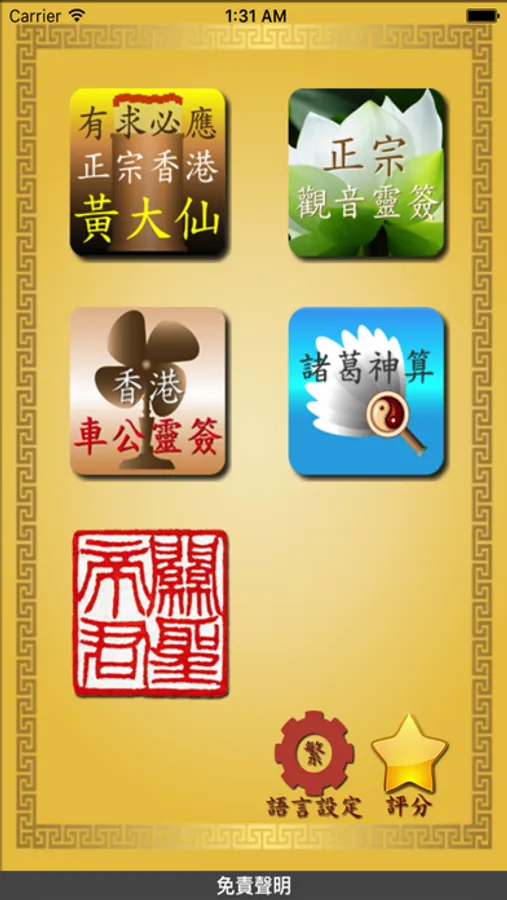 (1) 這是一個5合1求籤神算應用程式,包括最常用的黃大仙靈籤,觀音靈籤,車公靈籤,諸葛神算,關帝靈籤(文武廟)。利用這軟件,用戶可以進一步了解靈籤玄機,亦可在祠廟親身求簽後,自行查解簽文。