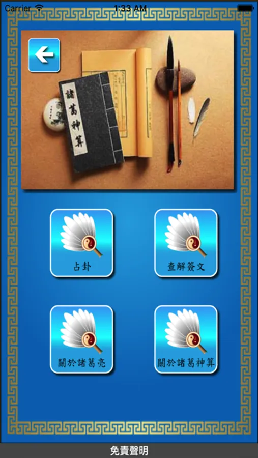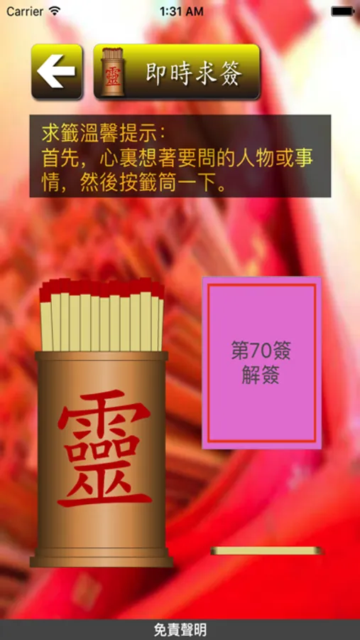 此軟件建議的求簽和查解簽文功能只作參考, 內容及程序都可能有所不足, 惟彼等並不擔保這軟件產生的資料之準確性及可靠性, 且概不會就因有關資料之任何不確或遺漏而引致之任何損失或損害承擔任何責任。大眾亦應明白玄學命理並非精密科學, 命運總要靠自己掌握。