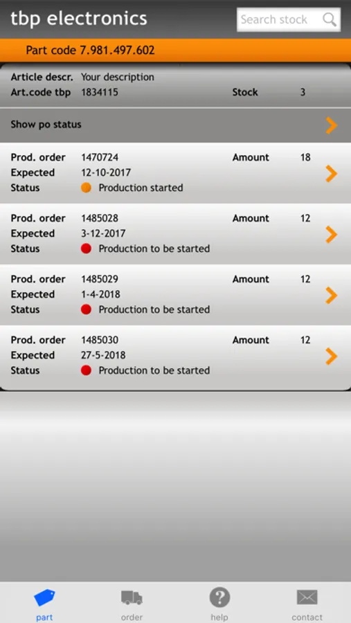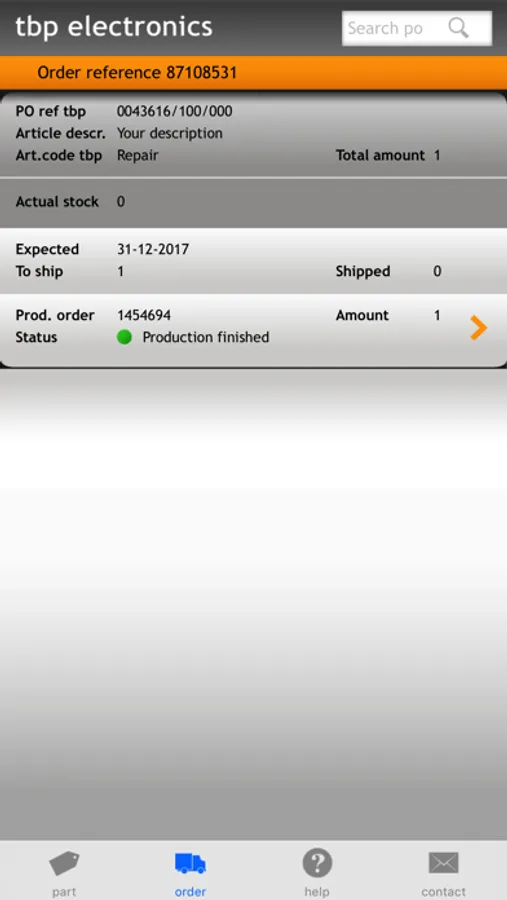 Met de App tbp ordertracking kunt u de status van het productieproces opvragen van uw lopende orders. Tevens is de huidige voorraad van uw producten realtime te raadplegen. U heeft de mogelijkheid te zoeken op uw artikel- of ordernummer of op het tbp artikelnummer.