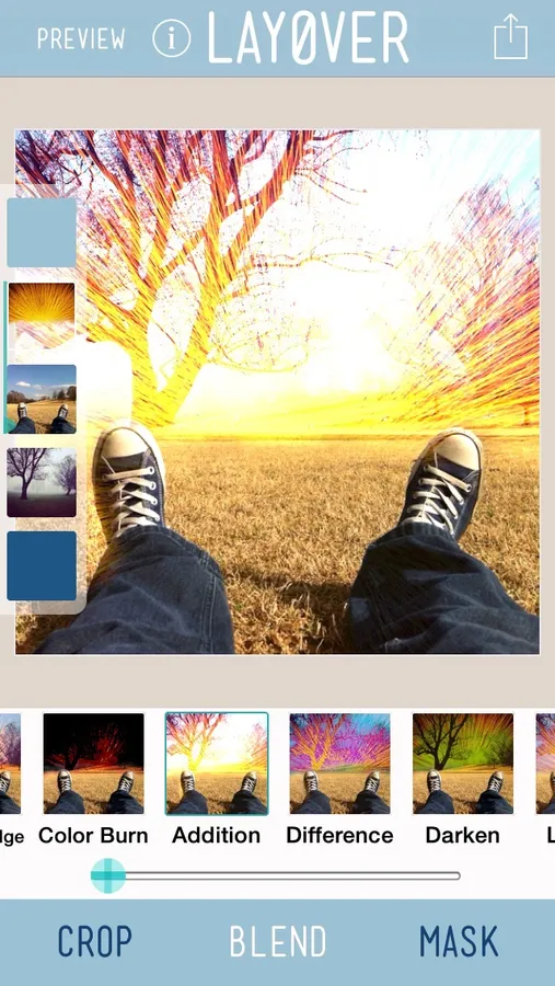 Layover lets you blend the colors, textures and images of up to five pictures to create a single image.