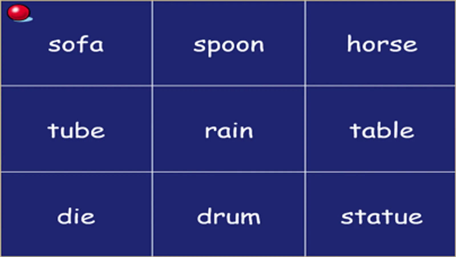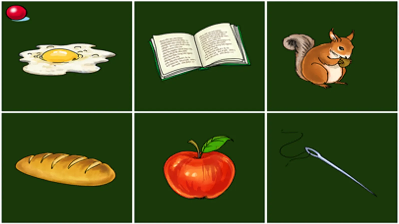A framed picture is shown and underneath it you will find a set of words. Can you find the right one? Once the correct answer have been given you will see only the correct, now larger, text and picture combined so you will remember it to the next time.