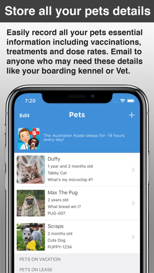 • New email sharing feature too. Quickly Email all your Pets information and history to your Vet or Pet minder.