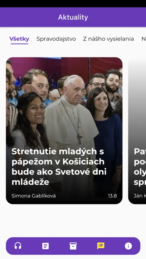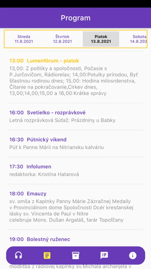 Radio LUMEN is slovak catholic/christian music-spoken radio with actual whole-social church, culture and society overlaying news monitoring. It´s offer contains life-sense and European spiritual values programs. Rich spiritual and liturgical program so. We are in spiritual community with listeners. Music in Radio LUMEN: „Order day“ music radio playlist finds inspiration in 60 – 90th years music of 20th century with contemporary music bonus. Middle music stream in this era (growing up especialy from slovac ang foreign pop, folk-rock and gospel-blues roats) is known to middle generation listeners and peacemaking so. Safety filling instantly offer, refreshing youth-age moments reminding, Non disrupting everyday problems resolving.