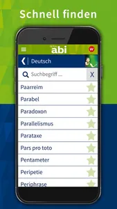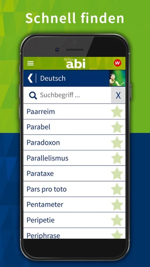 Die kostenlose Fit-fürs-Abi-App von Westermann ist ein Must-have für alle, die wichtige Fachbegriffe für ihr Abitur schnell und einfach nachschlagen wollen. Mehr als 2.000 Fachbegriffe bietet das umfangreiche Glossar aus insgesamt 11 Abiturfächern: Biologie, Chemie, Deutsch, Englisch, Erdkunde, Erziehungswissenschaft, Geschichte, Mathematik, Physik, Politik und Wirtschaft, Musik. Ein Lern-Check mit digitalen „Karteikarten“ hilft beim Auswendiglernen.