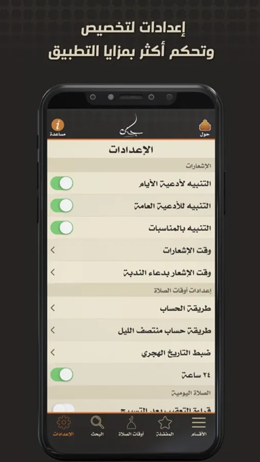 - قسم خاص بالمناسبات مقسمة حسب الأشهر الهجرية مع خاصية التنبيهات