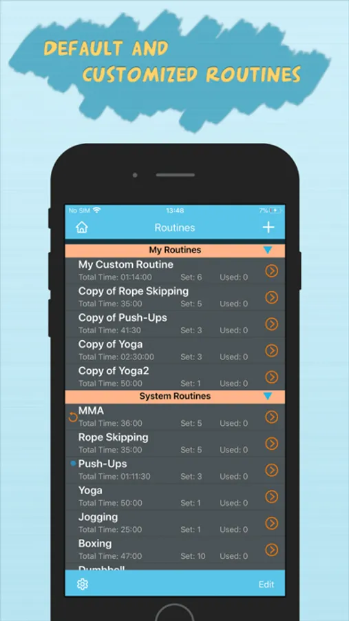 Eight free editable routines: MMA, Yoga, Pushups, Boxing, Rope Skipping, Dumbbell, Situps and Jogging.