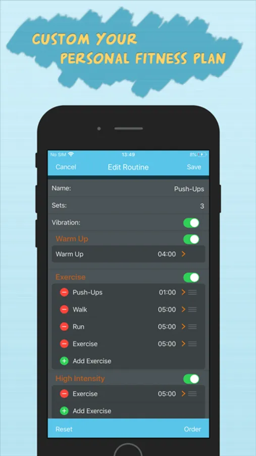 You can create unlimited interval timers which could include warm-up, high/low intensity, cool down and rest time etc, you can custom how many sets you wish to do.