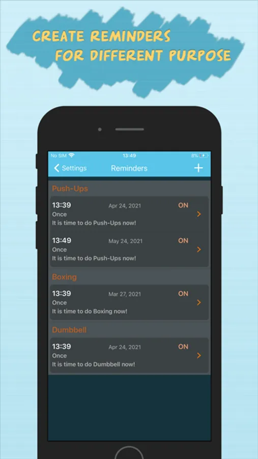 ⁃ Create unlimited reminders to alert you doing your workout or anything else.