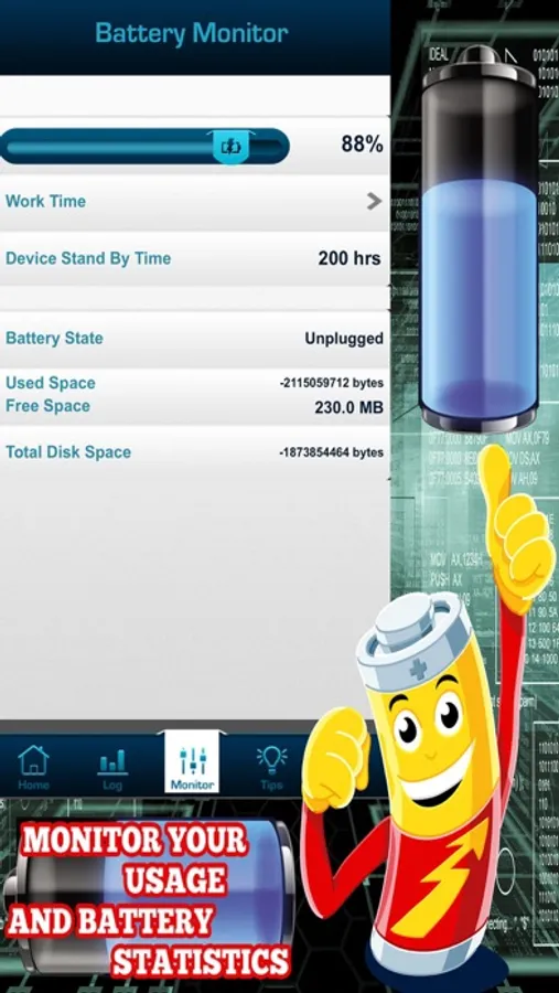 Monitor - To see your current battery state (charging/full) disk space, work time (For various tasks such as 3G, Talk Time, Gaming, GPS & Much much more!) and standby time.