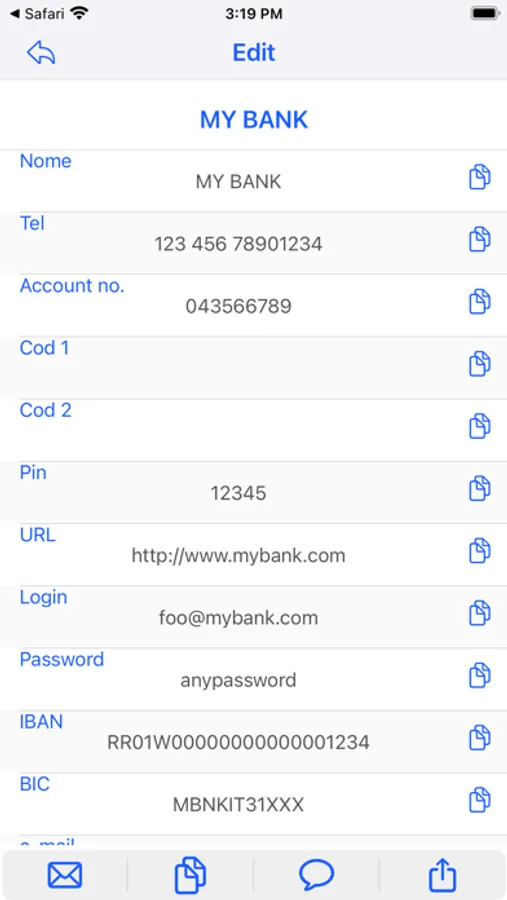 You can copy a password, an access code, any other data in an iDataSafe record to the clipboard and then paste it, for example, in a text field of the Safari browser, in a login box, in a password box: no need to remember all those lyrics!
