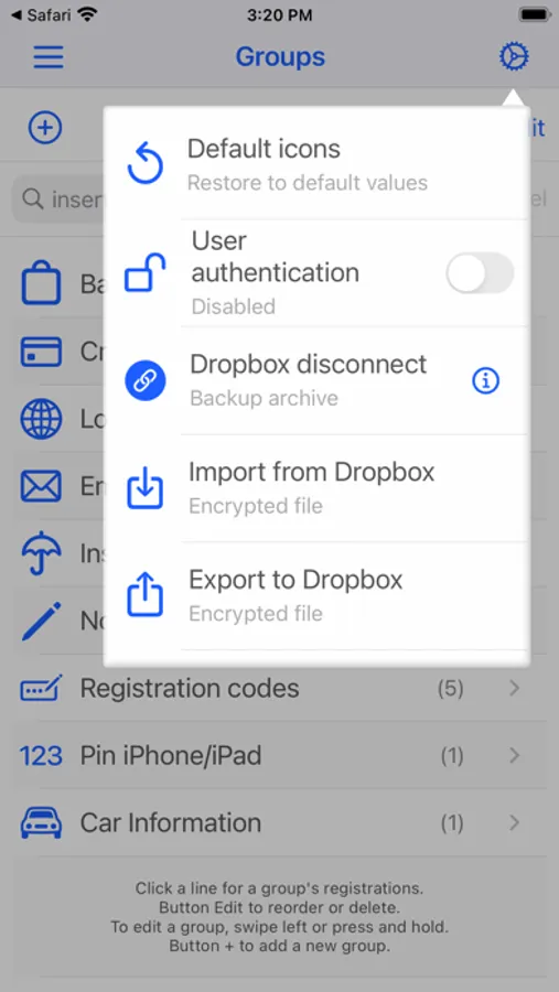 For added security, to save and retrieve data in case you want to create safe copies of your archive, on a certain date, you can also use Dropbox cloud services. All iDataSafe data will be stored in the cloud encrypted for your maximum security.