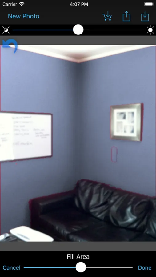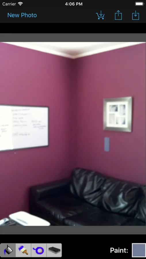 Start by taking a picture of the room you'd like to paint, then use the paint bucket to apply colors to the walls. In a well lit photo, the smart paint bucket will color the wall without bleeding on to neighboring walls or the ceiling. This gives you the control to get a clean picture of how the color would look, and you can even use multiple colors at the same time to try an accent wall!