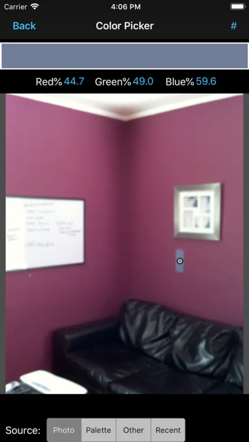 For great results try taping a color sample to the wall and take a photo of it. Use the color picker to select the sample, then use the paint bucket to start applying the color right next to the sample. Because the sample and the wall will be lit the same, this can take a lot of the guesswork out of how the color will look in the lighting of the room.