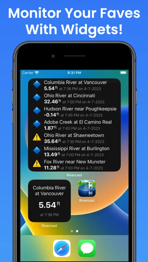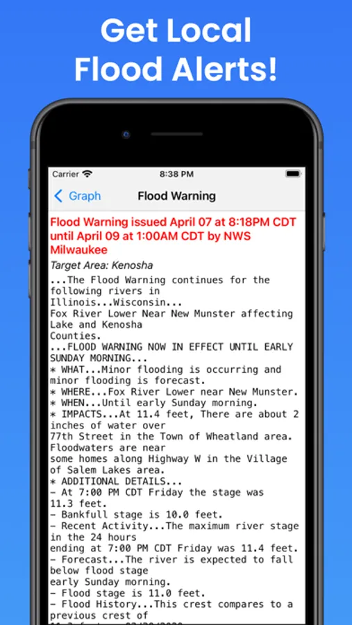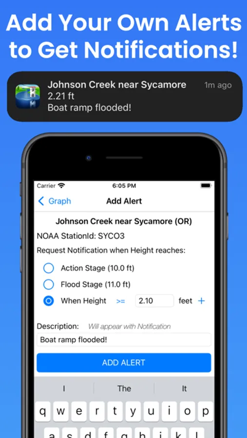 • Custom Push Notification Alerts for when river reaches levels of concern to you