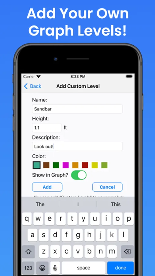 To customize your graphs for what's important to you, you can add your own level lines to mark things like sandbars, rocks, bridges, safe conditions, or whatever you would like.