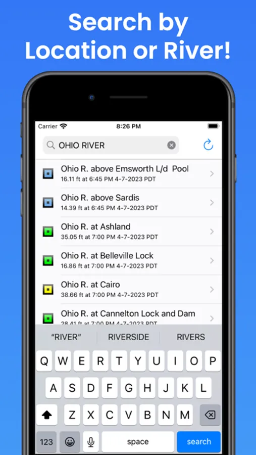 • Search interface to find river gauges by waterway name, state, or NOAA 5 digit station ID