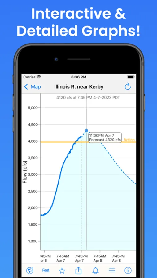You can get the latest observations from the map, search, or favorites. With an additional tap of your finger you can get a detailed interactive hydrograph. You can zoom in, zoom out, or pan with your fingers to find the exact information you need. If you "tap and hold" on the graph you can view the crosshair "bubble" text to assist you further.