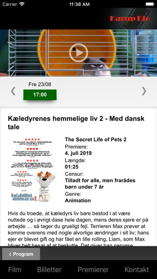 Med denne app har du mulighed for at gennemse programmet for Karup Bio, samt se yderligere filminformationer som trailer, censur, medvirkende skuespillere, varighed m.m.