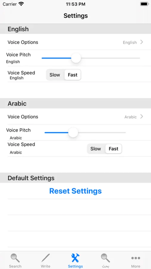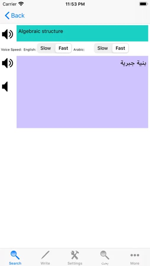 - Set the voice speed to listen words slowly or fast for both English and Arabic.