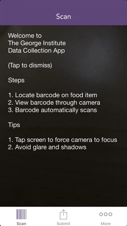 App overview – The George Institute Food Data Collector App helps users scan barcodes of food items and take photos of the nutritional information on the packaging. Images are transmitted to The George Institute for data entry and processing. Data is collected within a defined work program with a view to undertake research to improve the health of millions. The DCA is only available for use after consultation with The George Institute.